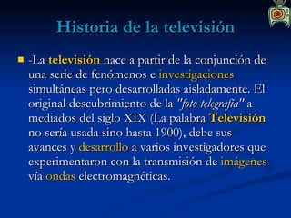La historia de la televisión comenzó a finales del siglo XIX cuando investigadores de varios países buscaban transmitir imágenes a distancia de forma similar al sonido. Esto se hizo posible gracias a tres descubrimientos clave: la fotoelectricidad, el análisis de fotografías en puntos y el uso de ondas hertzianas para transmitir señales eléctricas de imágenes. Dos modelos tempranos de televisión fueron la televisión mecánica y electrónica, siendo esta última superior en calidad. La