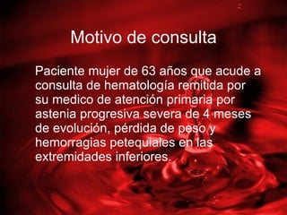 Mujer de 63 años presenta astenia progresiva, pérdida de peso y hemorragias desde hace 4 meses. Exámenes revelan anemia, trombocitopenia y leucopenia severas (pancitopenia). Biopsia de médula ósea muestra hipocelularidad, descartando enfermedades mieloproliferativas. El diagnóstico es anemia aplásica adquirida idiopática, caracterizada por deficiencia en la producción de todas las líneas celulares sanguíneas.