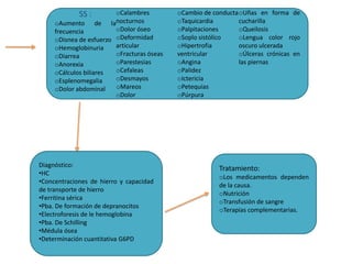 La anemia es una baja concentración de hemoglobina o eritrocitos en la sangre. Puede deberse a una menor producción de eritrocitos, como por deficiencias de hierro, vitamina B12 o ácido fólico, o a una mayor destrucción de eritrocitos, como en las anemias hemolíticas o por pérdida de sangre. Los síntomas incluyen fatiga, palidez, falta de aliento y aumento de la frecuencia cardíaca. El diagnóstico se realiza mediante análisis de sangre y méd