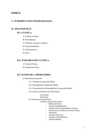Este documento proporciona una introducción a las anemias, incluyendo su definición, tipos, síntomas y métodos de diagnóstico. Explica que la anemia se define como una disminución de la masa de hemoglobina circulante y que puede deberse a una producción deficiente, un defecto en la maduración o un aumento en la destrucción o pérdida de hematíes. Detalla los principales síntomas cardiovasculares, neurológicos, cutáneos, gastrointestinales y genitourinarios asociados con diferentes tipos