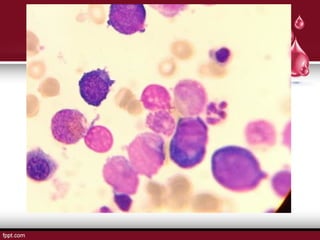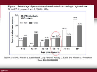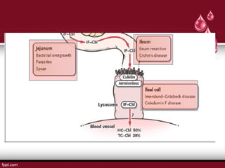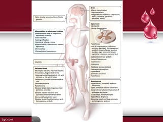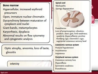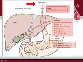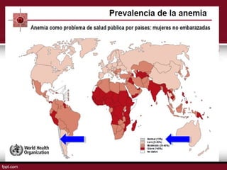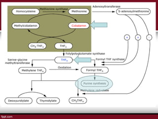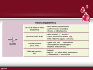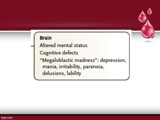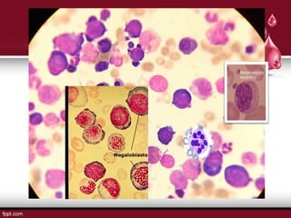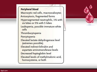 Este documento describe el caso de una mujer de 65 años con anemia megaloblástica. Presenta astenia, palidez y somnolencia. Los exámenes muestran anemia macrocítica con eritroblastos y plaquetopenia. La anemia megaloblástica se debe a déficit de vitamina B12 o ácido fólico, lo que causa trastornos en la maduración celular con gigantismo de los precursores. El tratamiento consiste en la suplementación de la vitamina B12 deficiente.