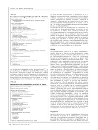 El documento describe la fisiopatología, etiología y manifestaciones clínicas de la anemia megaloblástica causada por deficiencia de vitamina B12 o folatos. La vitamina B12 y los folatos son necesarios para la síntesis de ADN en los precursores eritroides, y su deficiencia causa un aborto medular que conduce a anemia. Las causas más comunes son la malabsorción y la dieta inadecuada. Los síntomas incluyen anemia, alteraciones epiteliales como glositis, y trastornos neu