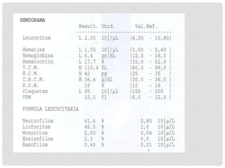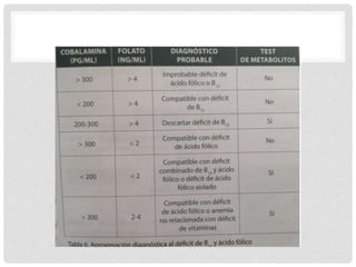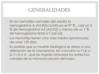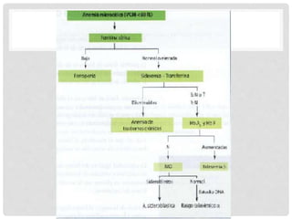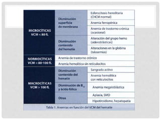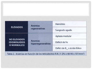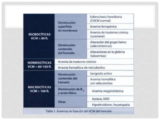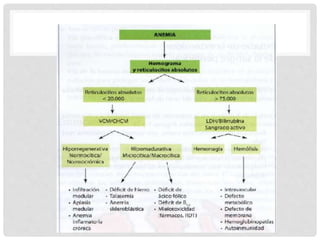 Este documento trata sobre la anemia. Explica que la anemia se define por la disminución de la masa eritrocitaria y que clínicamente se habla de anemia cuando disminuye el volumen de hematíes, el hematocrito o la concentración de hemoglobina. También clasifica las anemias según el tamaño del eritrocito en microcíticas, normocíticas o macrocíticas y explica que los reticulocitos son eritrocitos jóvenes cuya presencia en sangre periférica indica la función de la