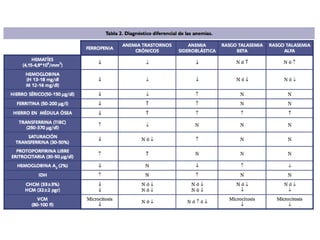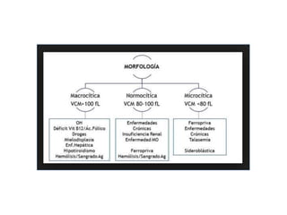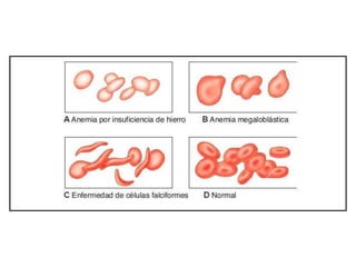 La anemia se define como una disminución de la masa eritrocitaria o de la concentración de hemoglobina. Puede ser causada por pérdida excesiva de sangre, aumento de la destrucción de glóbulos rojos o producción deteriorada de glóbulos rojos. Los síntomas incluyen fatiga, debilidad y palidez. La anemia ferropénica es la más común y está causada por deficiencia de hierro, mientras que la anemia megaloblástica implica defectos en la síntesis de ADN debido a