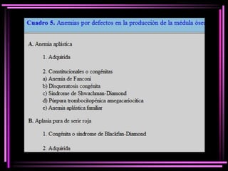 El documento proporciona información sobre las anemias. Define la anemia y explica sus mecanismos fisiopatológicos. Clasifica las anemias de acuerdo a su velocidad de instalación, patogenia y morfología. Describe en detalle la anemia ferropénica, la anemia megaloblástica y las anemias por defectos en la producción de la médula ósea.