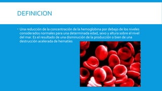 Las anemias se clasifican en fisiopatológicas (regenerativas y no regenerativas) y morfológicas (microcíticas, normocíticas y macrocíticas). Se describen varios tipos de anemias como la anemia de Fanconi, que se presenta entre los 2-10 años con pancitopenia y aumento del volumen corpuscular medio; la eritroblastopenia transitoria de la infancia, que causa una anemia normocítica con bajo recuento reticulocítico; y la anemia ferropénica, que es la forma más