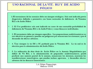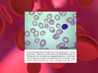 Este documento trata sobre las anemias. Define la anemia como un desbalance entre el aporte y la demanda de oxígeno manifestado por una disminución de la hemoglobina. Explica que las anemias se pueden clasificar según su evolución, morfología, fisiopatología y amplitud de distribución de los eritrocitos. Describe las causas, manifestaciones clínicas, diagnóstico y tratamiento de las anemias más comunes como la ferropénica, megaloblástica por déficit de vitamina B12 y