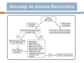 Este documento describe las anemias y su diagnóstico mediante el laboratorio. Explica que las anemias se clasifican según el tamaño y contenido de hemoglobina de los eritrocitos en microcíticas, normocíticas y macrocíticas. Describe las causas más comunes de anemia como la deficiencia de hierro, enfermedades crónicas e infecciosas. La herramienta principal de diagnóstico es la citometría hematica que mide parámetros como hemoglobina, recuento de eritrocitos y tama