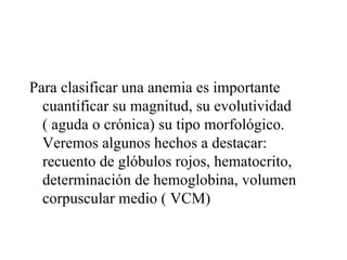 Este documento describe la anemia, definida como una disminución de la hemoglobina por debajo de los valores normales que varían según factores como la edad, sexo y altitud. Explica cómo clasificar la anemia en base al tamaño y forma de los glóbulos rojos, la concentración de hemoglobina y el recuento de reticulocitos. Además, clasifica la anemia en central u originada en la médula ósea, y periférica causada por hemólisis o pérdida de sangre. Finalmente, detalla los sínt