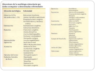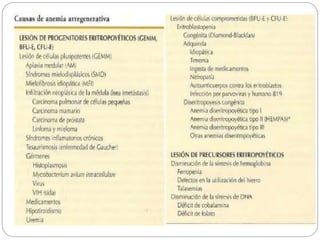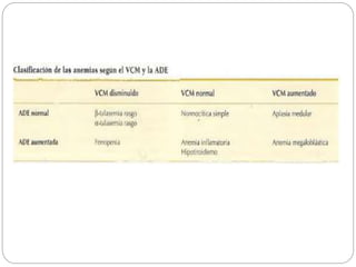 Este documento trata sobre la clasificación y diagnóstico de la anemia. Explica que la anemia se define por una disminución de la hemoglobina en la sangre. Clasifica la anemia según el volumen corpuscular medio (VCM) en microcítica, normocítica y macrocítica. También la clasifica según la respuesta reticulocitaria en anemia regenerativa y arregenerativa. Detalla los mecanismos de adaptación a la anemia, las manifestaciones clínicas y los pasos para la orientación diagnóstica basada en