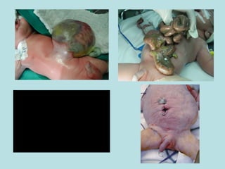 Este documento describe los tipos de defectos congénitos de la pared abdominal, incluidos gastrosquisis, onfalocele y extrofia vesical. Explica cómo medir la presión intraabdominal para determinar si un paciente puede someterse a cierre primario o requiere un silo. También cubre los pronósticos, complicaciones como el síndrome de compartimento abdominal, y consideraciones para el manejo anestésico de estos pacientes.