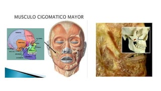 El documento describe los diferentes músculos del rostro y cuello, incluyendo sus orígenes, inserciones, acciones e inervaciones. Se detallan los músculos de la expresión facial, ojos, boca, lengua, mandíbula, cuello y cabeza.