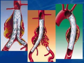 El documento habla sobre aneurismas aórticos. Brevemente describe que un aneurisma es una dilatación anormal de más del 50% del diámetro normal de una arteria. Afecta más a hombres mayores de 60 años de raza blanca. El 90% de los casos son infrarrenales. Pueden ser asintomáticos o causar dolor abdominal. La radiografía puede identificarlos.