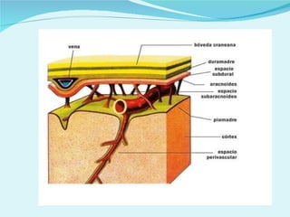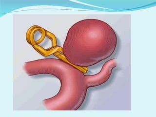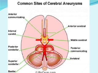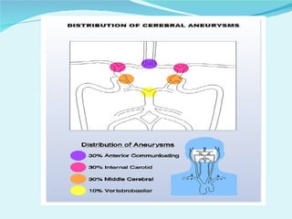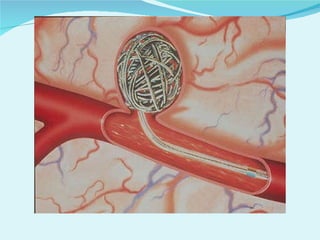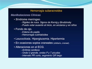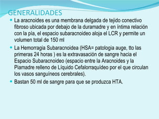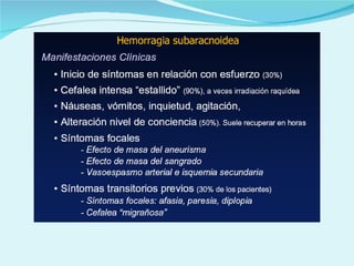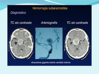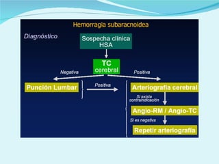 Este documento resume la hemorragia subaracnoidea, sus causas, diagnóstico y tratamiento. La hemorragia subaracnoidea es la salida de sangre al espacio entre la arachnoides y la piamadre, siendo la principal causa los aneurismas cerebrales. El diagnóstico incluye tomografía computarizada y angiografía, mientras que el tratamiento depende de la condición clínica del paciente y puede incluir cirugía, tratamiento endovascular u observación. Las complicaciones incluyen resangrado, vasoespasmo y