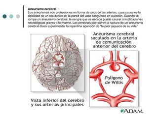 Los aneurismas cerebrales son protrusiones en forma de saco en las arterias del cerebro causadas por debilidad en la pared arterial. Cuando se rompen, pueden causar graves complicaciones neurológicas o la muerte. Generalmente ocurren en arterias frontales y tienen paredes finas debido a la pérdida de la capa muscular. El tipo más común es el aneurisma sacular, que representa el 90% de los casos.