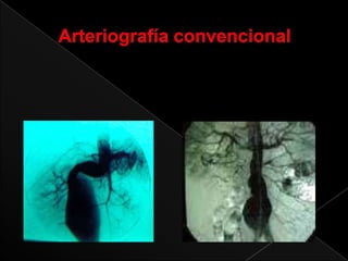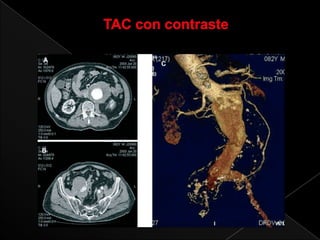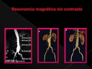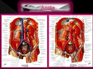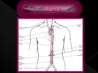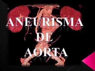 Este documento describe la anatomía y patologías de la aorta. La aorta es el vaso sanguíneo principal que se origina en el corazón y se bifurca en la arteria iliaca común. Los aneurismas y disecciones aórticas son patologías que involucran la dilatación y separación de las capas de la pared aórtica. Se detallan los síntomas, diagnóstico y tratamiento quirúrgico convencional y endovascular de estas afecciones.