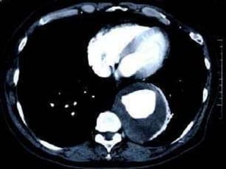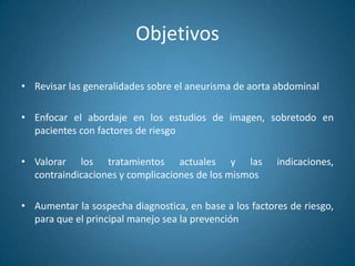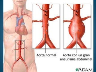 El documento proporciona información sobre el aneurisma de la aorta abdominal. Describe que es una dilatación anormal de la aorta que aumenta el riesgo de ruptura. Explica los factores de riesgo, métodos de diagnóstico como ecografía y TAC, y tratamientos como la reparación quirúrgica que se reserva para aneurismas mayores a 5-5.5 cm de diámetro debido al alto riesgo de ruptura.
