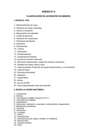 El documento clasifica los accidentes en minería en cuatro categorías: I) Según el tipo, que incluye desde desprendimientos de rocas hasta no uso de equipos de protección personal; II) Según la lesión anatómica, que abarca desde contusiones hasta intoxicaciones; III) Según el origen, ya sea por condición o acto subestándar; y IV) Según previsión, si eran previsibles o no.