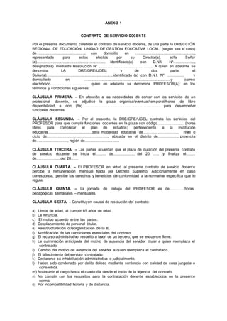 Este contrato establece los términos y condiciones del acuerdo entre una Dirección Regional de Educación y un profesor para que este último preste servicios docentes. El contrato especifica la plaza y la institución educativa a la que será asignado el profesor, el período de duración del contrato, la remuneración y beneficios que recibirá el profesor, su jornada laboral, las causales por las cuales el contrato puede resolverse, y que el acuerdo estará sujeto a la jurisdicción de los tribunales del