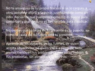 Este documento enfatiza que cada persona es responsable de su propio destino y futuro. Aconseja aceptar los errores propios y las dificultades en lugar de quejarse, y usar las experiencias pasadas para mejorar en el presente y futuro. También enfatiza la importancia de mantener una actitud positiva, trabajar duro, y no culpar a otros ni a la suerte por los fracasos.