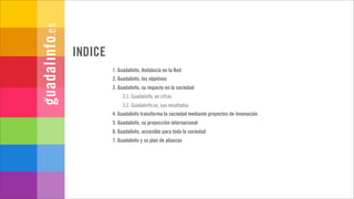 Guadalinfo es una red social pública de la Junta de Andalucía que ofrece acceso gratuito a Internet y formación digital en 757 centros ubicados en municipios menores de 20.000 habitantes. El proyecto ha tenido un gran impacto en la sociedad andaluza, con más de 600.000 usuarios registrados, y ha contribuido al crecimiento económico regional a través de la creación de empleo y el desarrollo de habilidades digitales entre los ciudadanos.