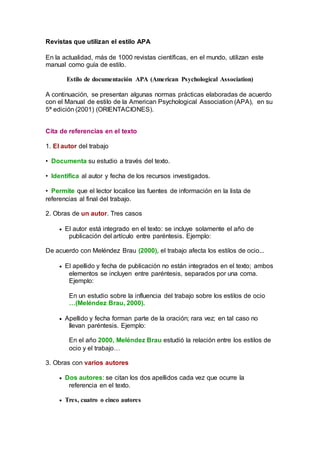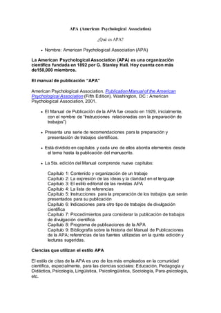 Este documento describe el estilo de citación APA (American Psychological Association). Explica que la APA es una organización científica fundada en 1892 que publica un manual de estilo para la preparación de trabajos científicos. El manual de estilo APA, ahora en su quinta edición, ofrece recomendaciones para el contenido, organización, estilo y formato de citas y referencias bibliográficas. El estilo APA se utiliza comúnmente en ciencias sociales como psicología, sociología y educación.