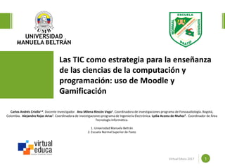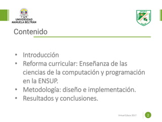 Este documento propone una reforma curricular en la Escuela Normal Superior de Pasto (ENSUP) para incluir la enseñanza de las ciencias de la computación y la programación mediante el uso de tecnologías de la información y la comunicación (TIC) y la gamificación. El documento describe la estructura curricular propuesta, los objetivos, la metodología que incluye el uso de Moodle y actividades gamificadas, y los resultados preliminares después de implementarla con 70 estudiantes donde la mayoría logró avanzar al nivel más alto.