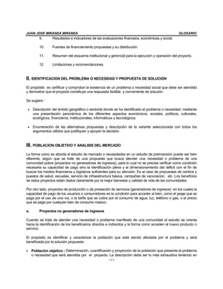 Este documento presenta una lista de verificación para la presentación de proyectos que incluye temas y datos a consignar. La lista sugiere incluir un resumen del proyecto, identificación del problema y propuesta de solución, análisis de mercado y población objetiva, estudio técnico, organización, aspectos institucionales y jurídicos, y aspectos financieros. La lista provee una guía detallada para la estructura y contenido de documentos de proyectos con el fin de facilitar su presentación a instituciones de crédit