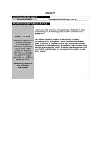 Este documento identifica el público objetivo de la campaña de marketing del blog Casidesgraciados.blogspot.com.ar. El público objetivo son jóvenes y adultos de 21 años o más que viven en el conurbano bonaerense. Se ha definido este público objetivo utilizando criterios sociodemográficos como la edad, sexo, lugar de residencia, educación y posición en el hogar. Se considera que este segmento de la población podría ver al fútbol como un negocio a largo plazo en lugar de un pasatiempo