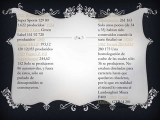 Este documento presenta una lista progresiva de los automóviles de producción más rápidos del mundo, liderada actualmente por el Bugatti Veyron Super Sport que alcanzó 431 km/h en 2010. La comparación de velocidades entre vehículos históricos es difícil debido a la falta de estándares para medir la velocidad máxima. El documento incluye detalles como marcas de velocidad, años de producción y cantidades producidas para varios automóviles notables a lo largo de la historia.
