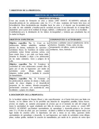 La propuesta busca crear una escuela de danza y artes llamada ART DANCE ACADEMY en la localidad de Bosa, Bogotá para brindar oportunidades artísticas a adolescentes de 13 a 19 años. La escuela enseñará danza, artes plásticas, ejercicios físicos y más para promover estilos de vida saludables, alejar a los jóvenes de problemas sociales y fortalecer la comunidad. La propuesta detalla los objetivos, metas, actividades, cronograma y presupuesto del proyecto.