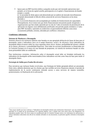 Este documento establece criterios adicionales de elegibilidad y condiciones administrativas para propuestas que incluyan acciones de microfinanzas. Los criterios adicionales de elegibilidad incluyen que los solicitantes deben haber ejecutado al menos 3 iniciativas similares en los últimos 3 años y disponer de personal técnico calificado. Los socios locales deben ser instituciones microfinancieras establecidas que hayan prestado servicios de manera sostenible por 3 años. Las acciones elegibles incluyen fortalecimiento de capacidades y