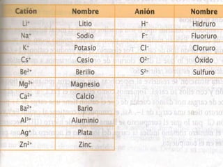Este documento explica cómo se nombran los compuestos binarios, que están formados por dos elementos. Indica que los compuestos que contienen un metal y un no metal se clasifican según el tipo de catión presente, y que para nombrarlos se menciona primero el anión y luego el catión, con su proporción. También da ejemplos como el cloruro de sodio (NaCl) y el bromuro de aluminio (AlBr3).