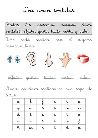 El documento presenta información sobre los cinco sentidos humanos: olfato, gusto, tacto, vista y oído. Se incluyen actividades interactivas para asociar cada sentido con su órgano correspondiente y objetos relacionados. Además, se describen los cuatro sabores principales y se proponen ejercicios para vincular cada sabor con su alimento correspondiente.