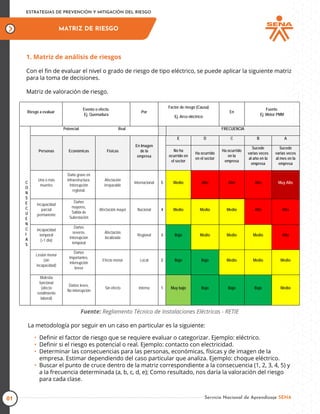 Este documento presenta estrategias de prevención y mitigación del riesgo eléctrico en motores de corriente alterna sincrónicos de imanes permanentes. Incluye una matriz de riesgo que evalúa factores como la frecuencia y consecuencias de posibles eventos para determinar el nivel de riesgo. También describe medidas de control como el uso de equipos de protección personal y la certificación de personal para realizar trabajos eléctricos de manera segura.