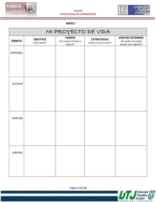 El documento presenta información sobre estrategias de aprendizaje, incluyendo la organización del lugar de estudio, la organización mental y la organización del tiempo. Se describen factores como disponer de un espacio silencioso y libre de distracciones, clasificar la información y distribuir el tiempo de forma equilibrada entre las tareas. El objetivo es aplicar principios y conductas que permitan un aprendizaje eficaz, eficiente y efectivo.