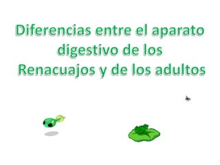 El documento describe la anatomía digestiva de los anfibios. Menciona que cuando son renacuajos son herbívoros y que la lengua de los anfibios secreta una sustancia pegajosa. Describe las características de la boca, esófago, estómago, intestino delgado e intestino grueso de los anfibios y sus funciones en la digestión.