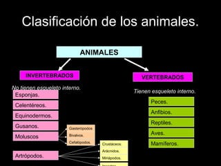 Este documento describe la clasificación de los animales, con una sección enfocada en las características de los anfibios. Los anfibios se caracterizan por vivir en zonas con agua dulce, tener una piel húmeda y resbaladiza, respirar a través de pulmones o la piel, y reproducirse mediante huevos pequeños y sin cáscara que ponen en el agua, donde las crías sufren un proceso de metamorfosis desde que nacen hasta que son adultos.