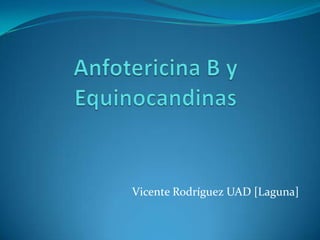 Este documento describe las propiedades de la anfotericina B y las equinocandinas, que son antibióticos antimicóticos. La anfotericina B se obtiene de Streptomyces nodosus y tiene un amplio espectro de actividad contra hongos como Candida y Aspergillus. Su mecanismo de acción implica la unión al ergosterol de la membrana fúngica. Se usa para tratar infecciones micóticas graves pero puede causar nefrotoxicidad. Las equinocandinas inhiben la síntesis de glucano