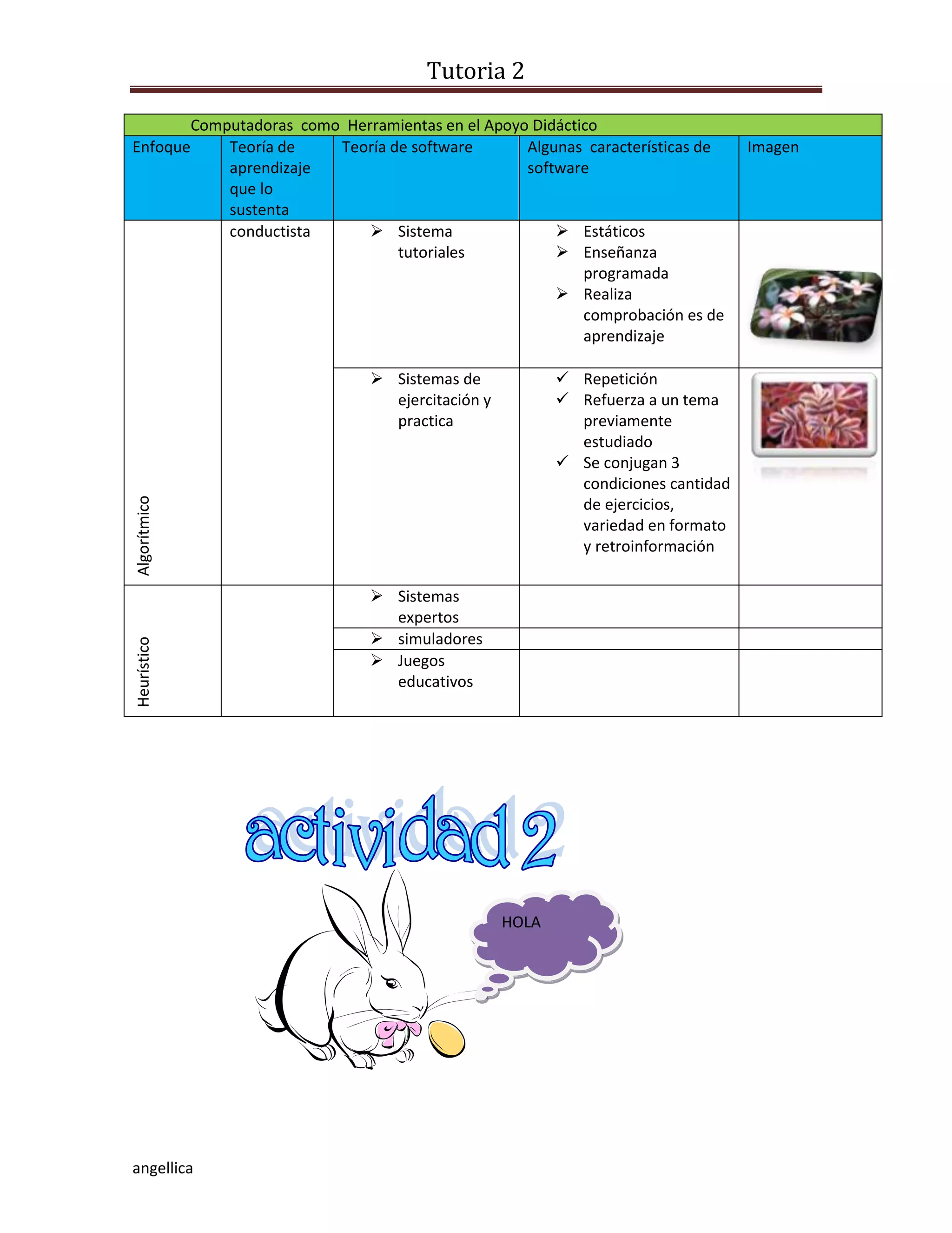 El documento clasifica diferentes tipos de software educativo basados en teorías de aprendizaje. Incluye sistemas tutoriales estáticos basados en la teoría conductista, sistemas de ejercitación y práctica que refuerzan temas a través de repetición, y sistemas heurísticos como simuladores y juegos educativos basados en un enfoque más constructivista del aprendizaje.