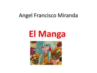 El documento describe el origen y características del manga. El manga nace de la combinación de la tradición gráfica japonesa y la historieta occidental. Algunas de sus características distintivas incluyen que las viñetas se leen de derecha a izquierda y que varias revistas de manga tienen tiradas semanales superiores al millón de ejemplares. El manga también se exporta a Occidente donde se invierte el formato para que se lea de izquierda a derecha.