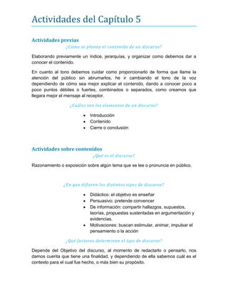 Este documento contiene las actividades de un capítulo sobre discursos. Incluye preguntas sobre cómo planear el contenido y elementos de un discurso, así como diferentes tipos de discursos. También presenta un ejemplo de discurso escrito por el estudiante sobre la necesidad de proteger el medio ambiente para las futuras generaciones.