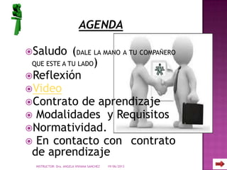 La instructora Dra. Angela Viviana Sánchez presenta una agenda sobre el contrato de aprendizaje que incluye una reflexión, video, y discusión sobre los requisitos, normatividad y proceso para establecer un contrato de aprendizaje según la ley colombiana.