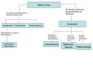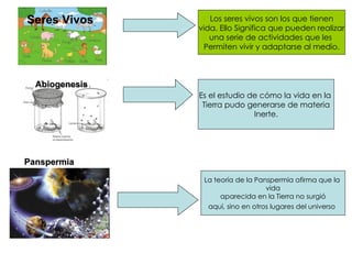 El documento habla sobre el origen de la vida. Menciona teorías como la abiogénesis, panspermia y generación espontánea. Explica que los seres vivos pueden evolucionar a través de las generaciones mediante mecanismos como la selección natural, y que la paleontología aporta evidencia de la evolución.