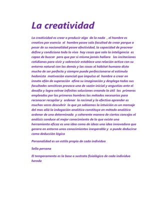 La creatividad es la capacidad de crear o producir algo de la nada. El ser humano es creativo por naturaleza debido a que posee afectividad y la capacidad de procrear, lo que lo define y condiciona. El estímulo hedonista que impulsa al ser humano a crear para superarse despierta su imaginación y facultades sensitivas, lo que provoca soluciones creativas para crear lo útil.