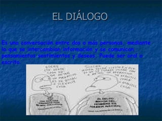 El documento habla sobre diferentes tipos de comunicación oral como el diálogo, el discurso y el debate. Explica las características de cada uno, como que el diálogo es una conversación entre dos o más personas, el discurso es dirigirse a un público con el objetivo de persuadir, y el debate es una discusión sobre un tema polémico entre bandos opuestos. También cubre la entrevista, que es un diálogo con preguntas y respuestas sobre temas profesionales y personales.