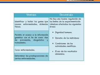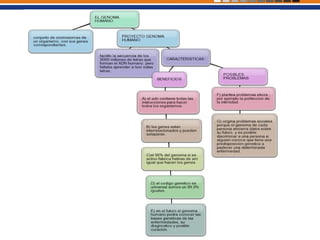 El documento describe el código genético y el genoma humano. Explica que el código genético contiene instrucciones para la construcción de proteínas y está compuesto de cuatro bases nitrogenadas. También describe el Proyecto del Genoma Humano, cuyos objetivos incluyeron identificar los genes humanos y su secuencia de ADN, y analizar los resultados para mejorar el diagnóstico y tratamiento de enfermedades. Finalmente, discute algunas controversias éticas relacionadas con las pruebas genéticas y la propiedad intelectual de la información gené