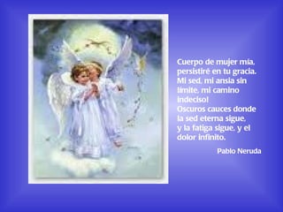 Este poema de Pablo Neruda describe el cuerpo de una mujer como blancas colinas y muslos blancos, y cómo el cuerpo del poeta, como un labriego salvaje, la penetra profundamente y hace brotar al hijo de lo más profundo de la tierra. El poema también expresa la persistencia del poeta en la gracia de la mujer y su sed, ansia y camino indeciso por ella. El segundo poema de Gabriela Mistral describe diferentes tipos de besos, incluyendo besos que pronuncian la sentencia de amor y besos que se dan con la