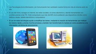 El documento describe cómo las Tecnologías de la Información y Comunicación (TIC) han cambiado la vida cotidiana al volverse parte integral de ella. Más del 80% de la población usa dispositivos móviles y las TIC ayudan a simplificar tareas y acceder a información de manera rápida. Las TIC se usan en el hogar para comunicación, entretenimiento y facilitar actividades diarias, y en el ámbito educativo y laboral como herramientas de apoyo y para mejorar procesos productivos.