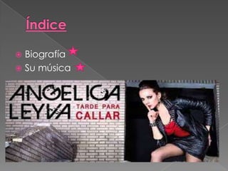 La biografía describe a Angélica, una cantante española nacida en Madrid en 1979 que ha estado involucrada en la música desde una edad temprana. Su talento natural la ha llevado a interpretar una amplia gama de estilos musicales que van desde el flamenco puro hasta fusiones más modernas. Hace dos años, lanzó un proyecto llamado "Flamenco-Retro'p" que rescata sonidos antiguos para mezclarlos con el flamenco de una manera innovadora. Más recientemente, Angélica participó en el